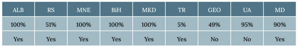 Similar reports were also published for Albania, Bosnia-Herzegovina, Montenegro, North Macedonia, Serbia and Kosovo (not recognized by 5 EU member states and Serbia) as well as for Ukraine, Moldova, and Türkiye. Although the EU’s General Affairs Council declared in June 2018 that Türkiye’s accession process had “effectively come to a standstill”—with no further chapters to be opened or closed and no progress on modernizing the EU-Türkiye Customs Union—the EU continues to evaluate Türkiye’s integration progress and includes it in its annual assessments.