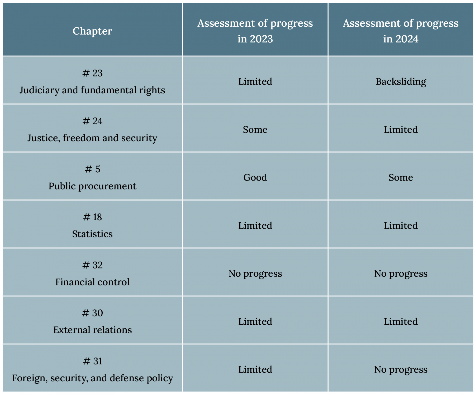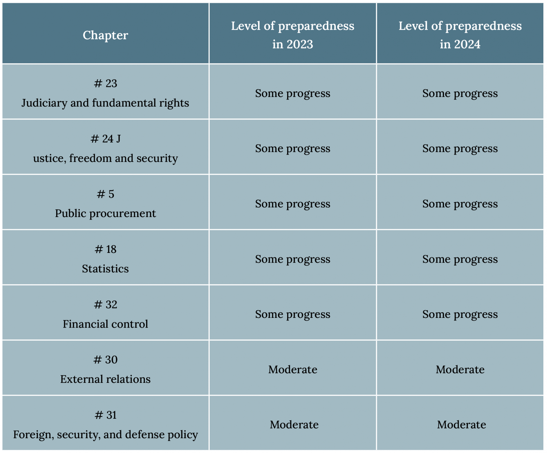 The EU has assessed Georgia as being at “some level of preparation ” in the five chapters of Cluster #1. However, when evaluating progress, the EU noted that since November 2023, Georgia has been backsliding in Chapter 23 (Judiciary and Fundamental Rights). No progress was recorded for Chapter 32, limited progress for Chapters 24 and 18, and some progress for Chapter 5.