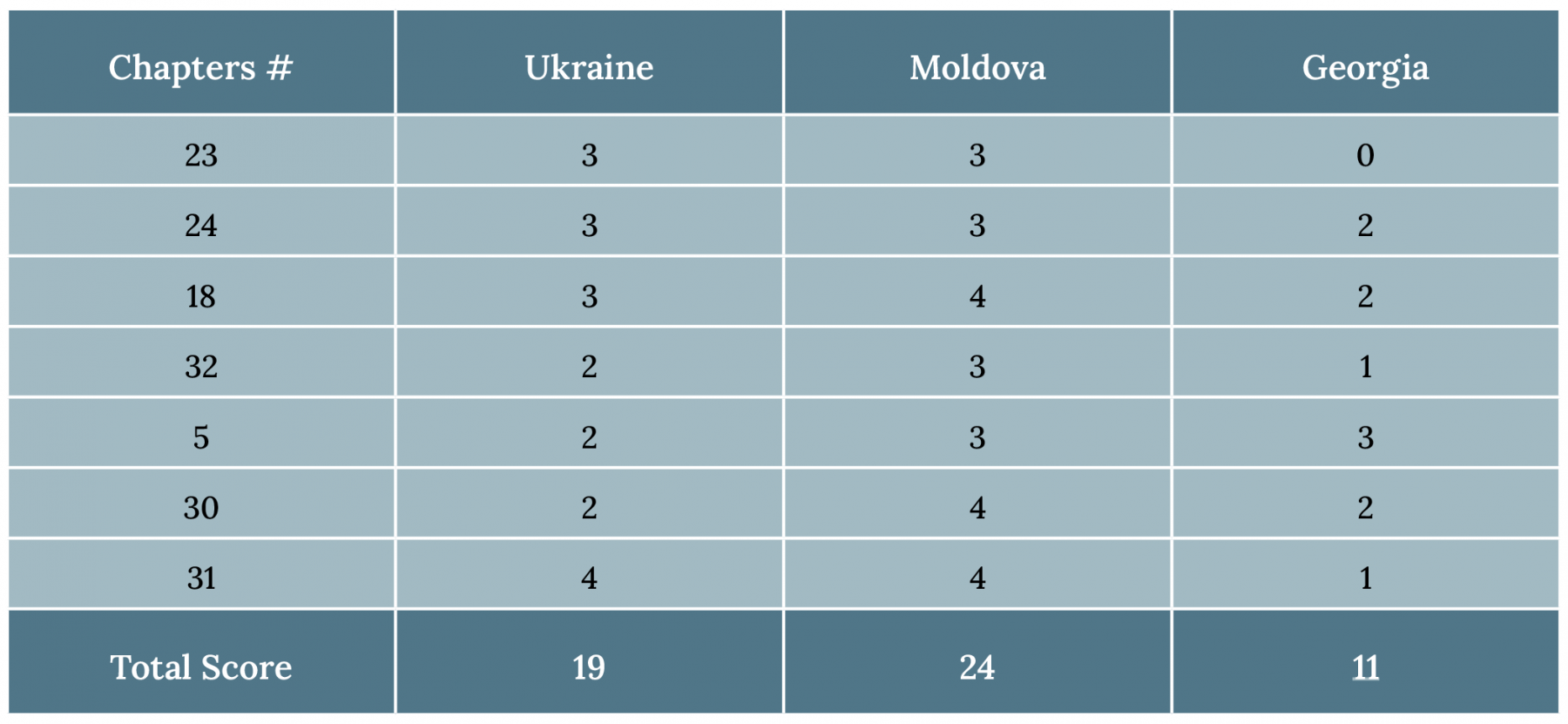 Using the European Stability Initiative’s (ESI) methodology and scoreboard (backsliding = 0, no progress = 1, limited progress = 2, some progress = 3, and good progress = 4), it becomes evident that Moldova and Ukraine outperformed Georgia over the past year. In the seven key chapters assessed, Georgia experienced backsliding or no progress in three areas, limited progress in three others, and only managed some progress in one.