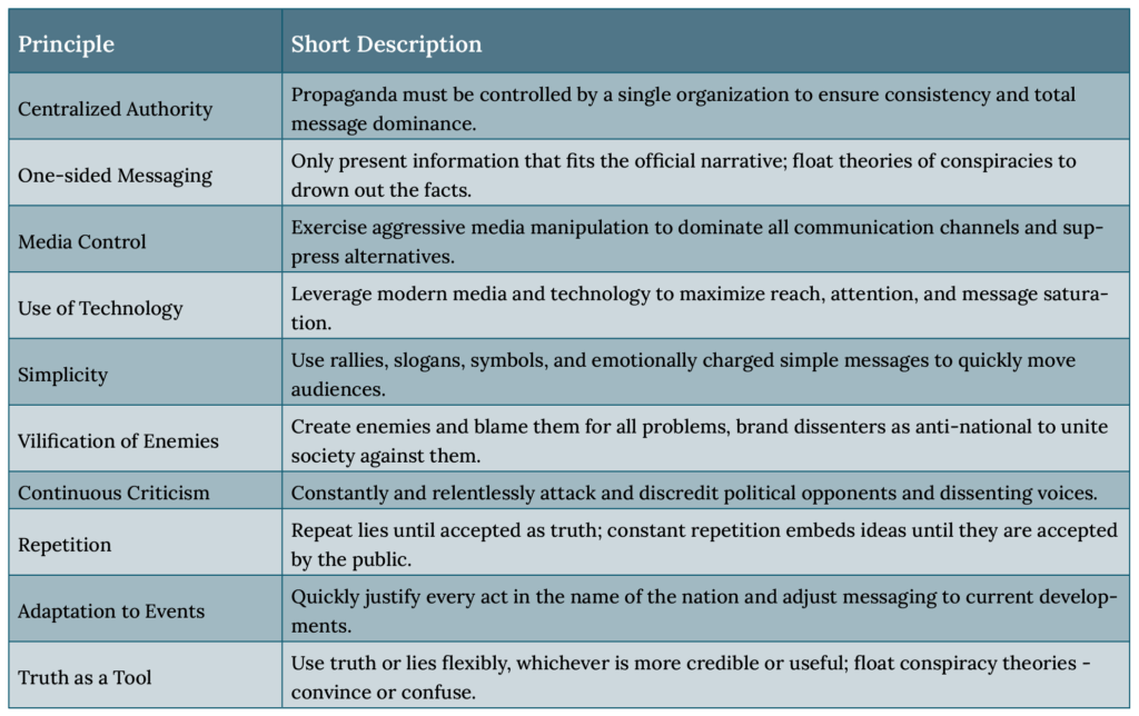 This article highlights a widely cited list of Goebbels’s ten principles, categorizing them into two groups: structural elements that concern the organization and enforcement of propaganda, and narrative elements that pertain to the actual content. While structural methods have evolved in response to digital hyperconnectivity, the narrative strategies remain strikingly consistent. The following sections examine each principle alongside concrete examples from the Georgian Dream’s propaganda, showing how these enduring tactics persist in a new information and technology environment.