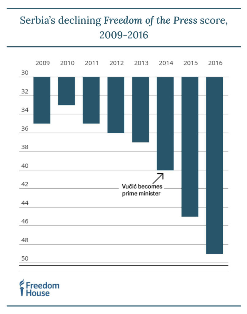 Media subversion is one of Vučić’s strong suits. After all, he served as the Minister of Information under Slobodan Milosevic’s genocidal rule and already has mastered the country’s media scene as well as the techniques of pressure and intimidation. Rebranded as a committed democrat, Vučić often warped market forces to shape the country’s media scene to his liking. By 2012, Serbia had a panoply of media operators – including influential independent television stations, local press, and several state-controlled outlets – national and regional TV stations, newspapers, and a state news agency. However, although the media’s political and opaque financial patronage has long been a concern, they took off after 2012, flooring the press freedom index (see the graph above).
